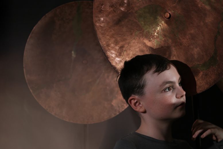 Fragmenting and layering are reflected in the artists’ experimental practice spanning fused glass, concrete, electroformed bronze and sound. Using printmaking techniques such as plating, resisting and masking on hand hammered bronze cymbals, a patina of the subterranean is formed, while the sounds of wind woven with cello evokes a sonic experience of slow erosion over time.